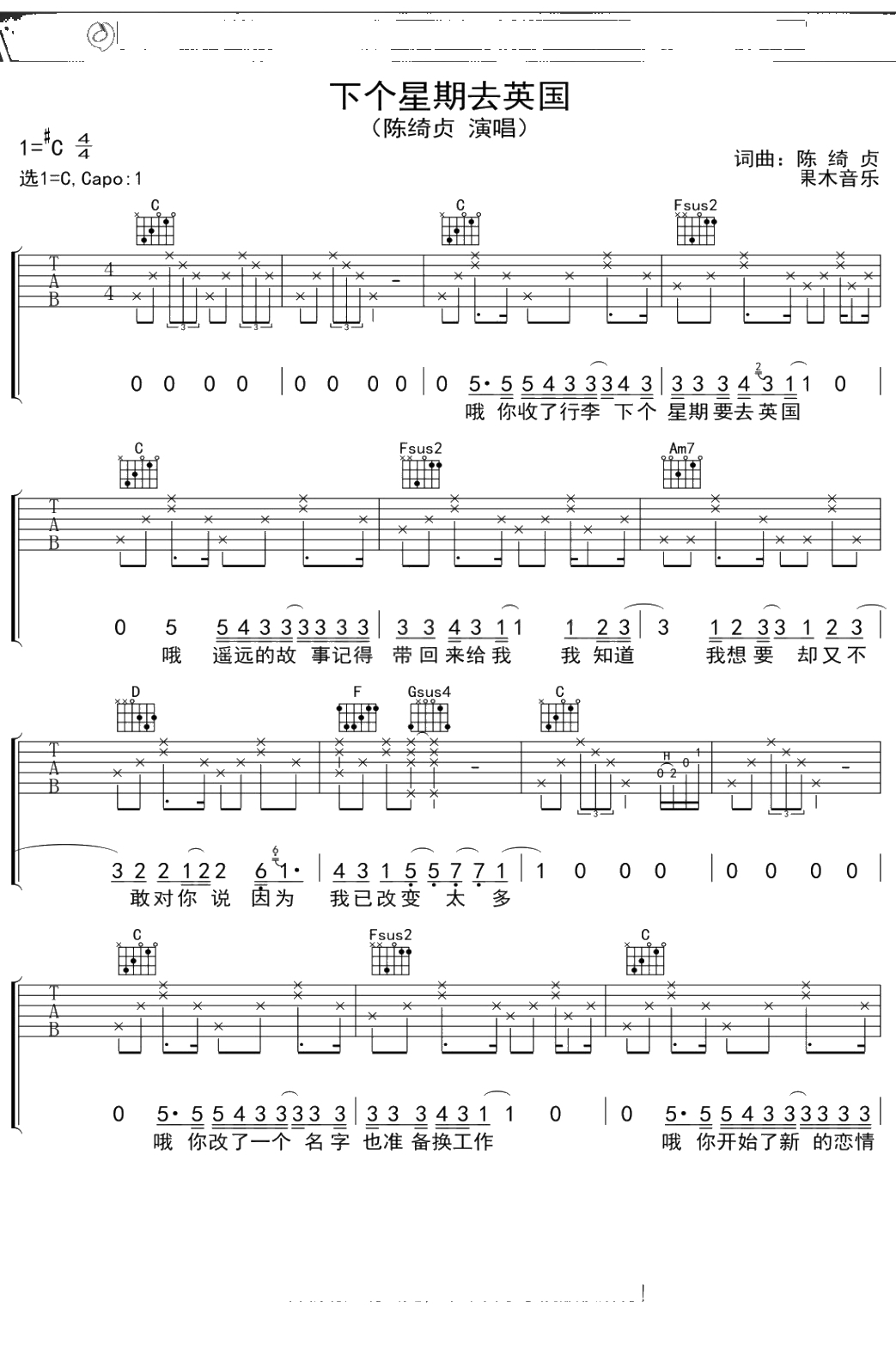 陈绮贞《下个星期去英国》吉他谱 弹唱六线谱
