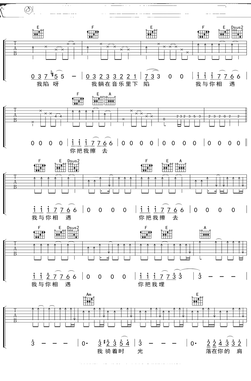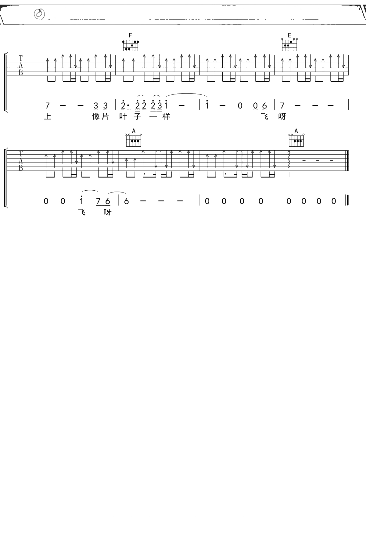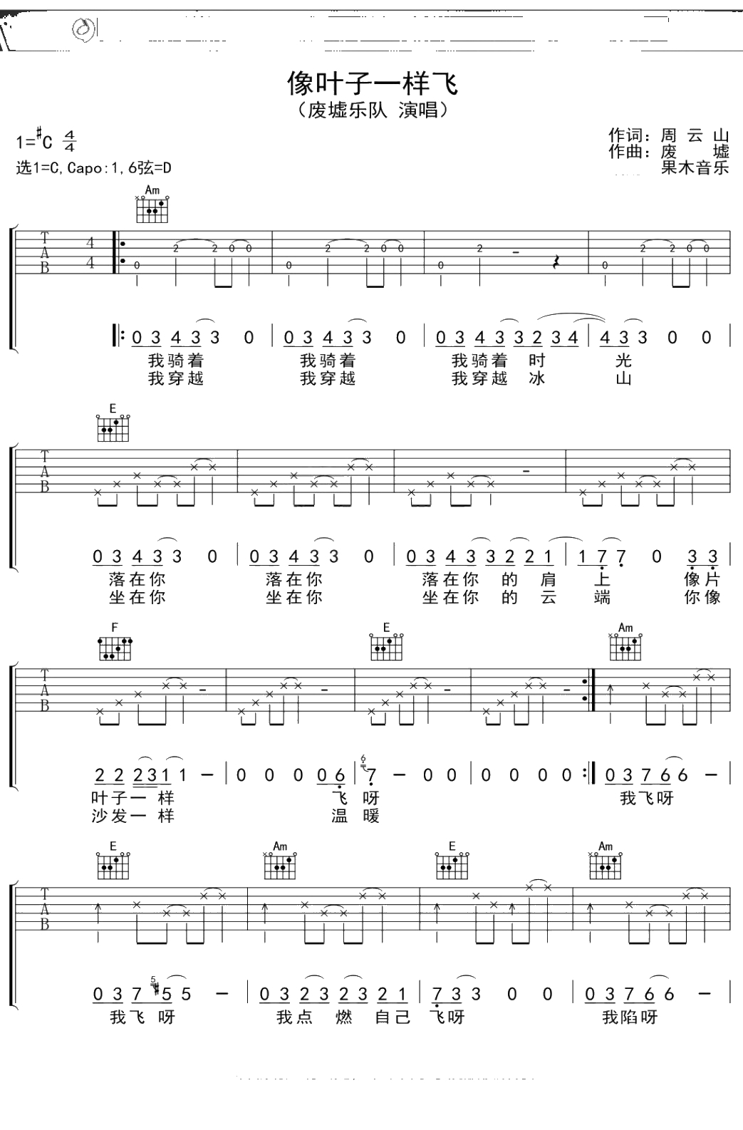 废墟乐队《像叶子一样飞》吉他谱 弹唱六线谱
