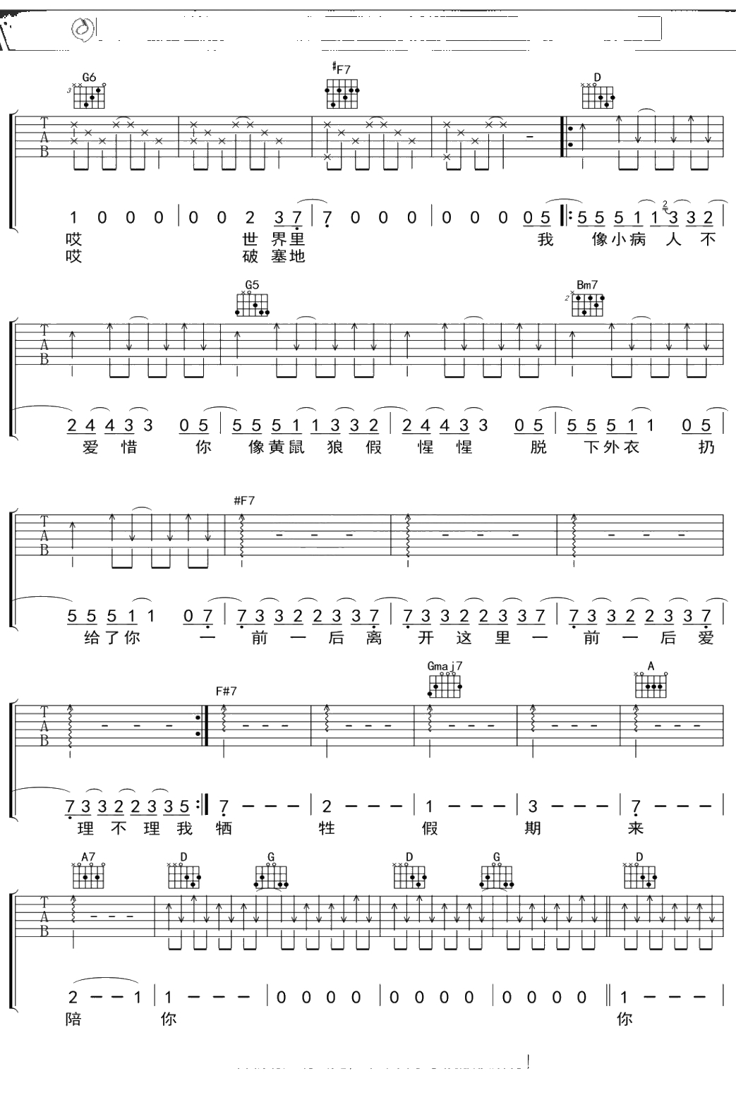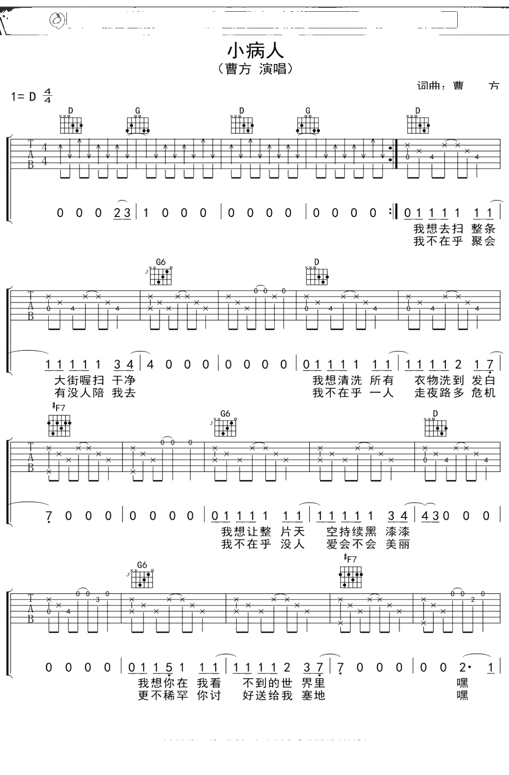 曹方《小病人》吉他谱 弹唱六线谱