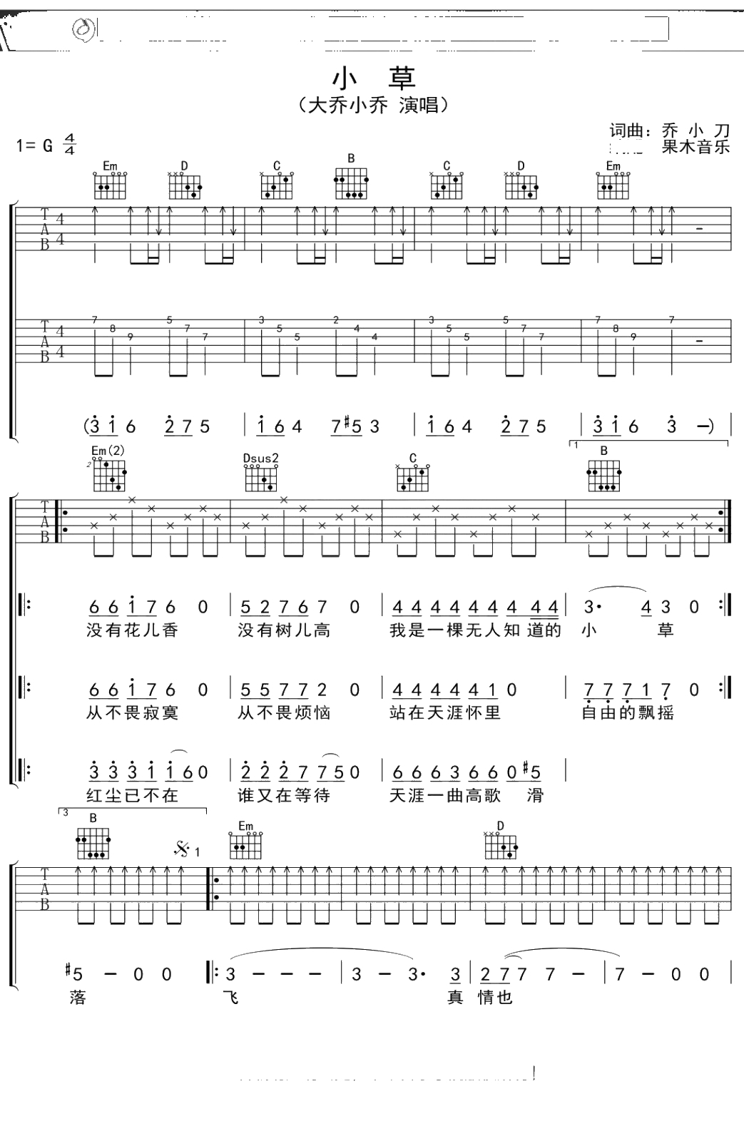 大乔小乔《小草》吉他谱 弹唱六线谱