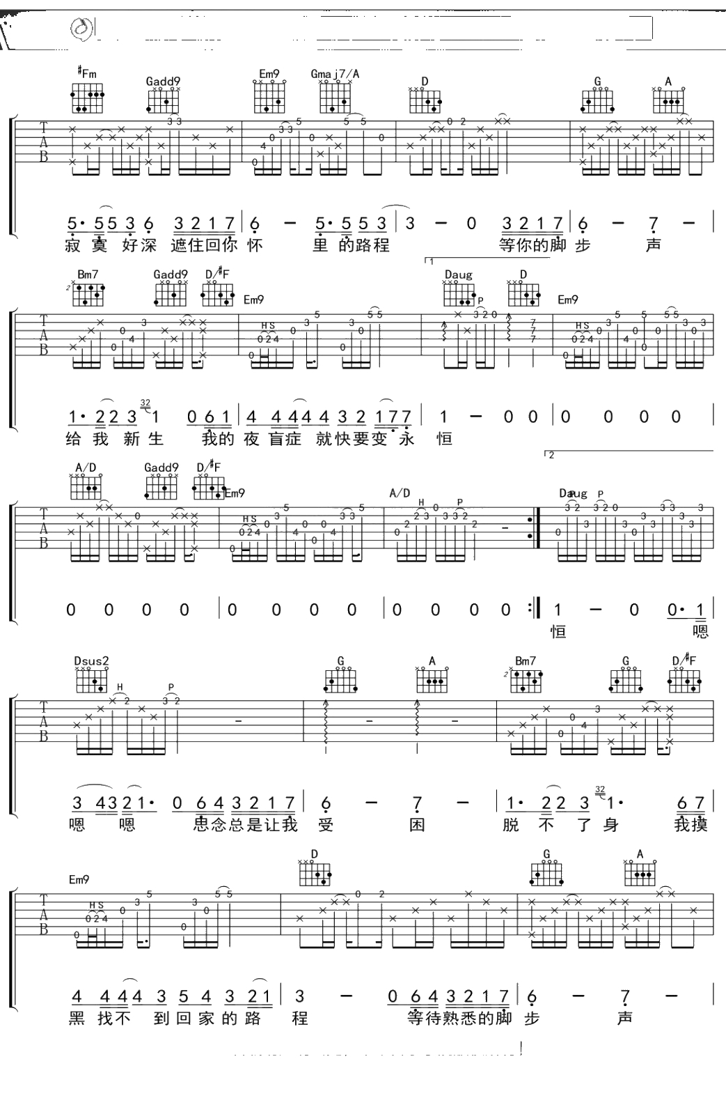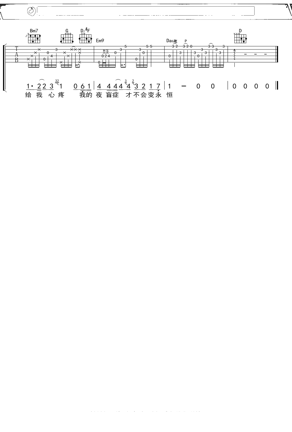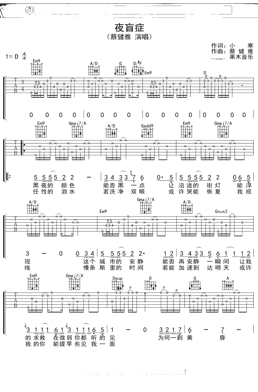 蔡健雅《夜盲症》吉他谱 弹唱六线谱吉他谱