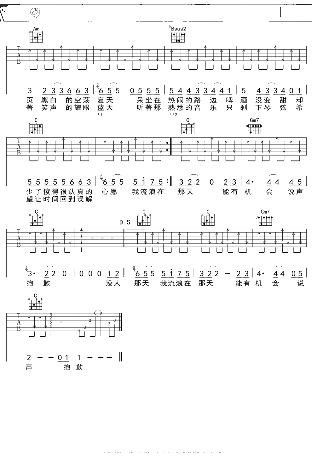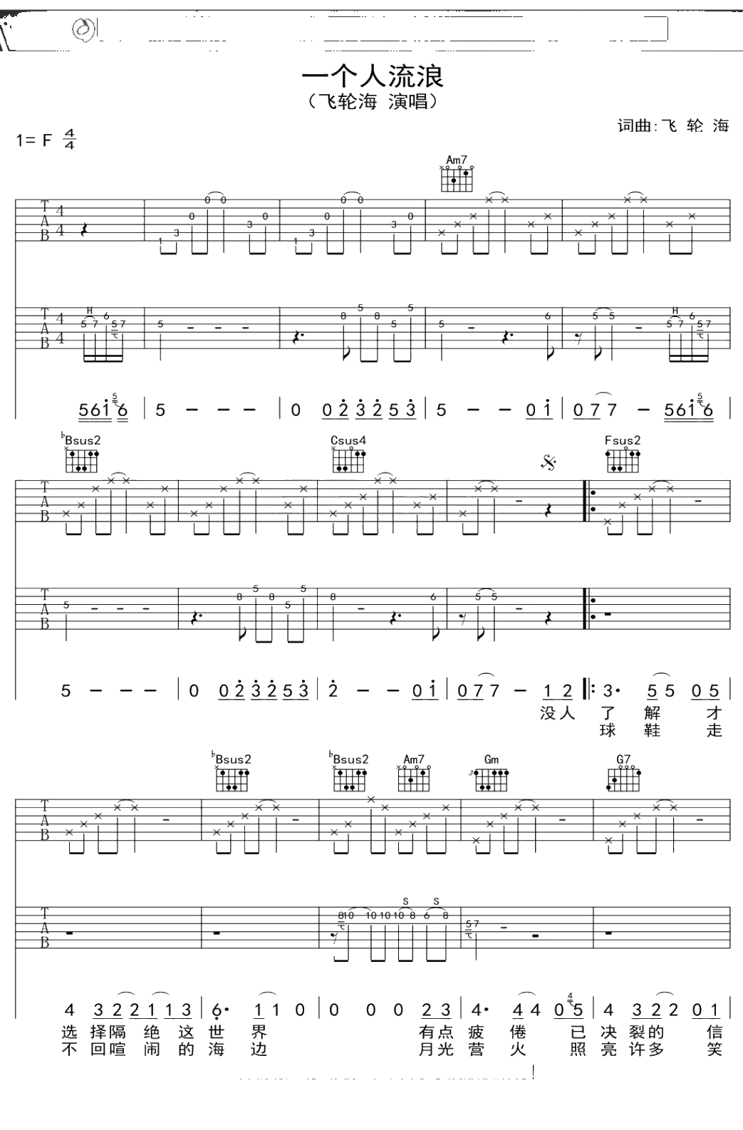 飞轮海《一个人流浪》吉他谱 弹唱六线谱