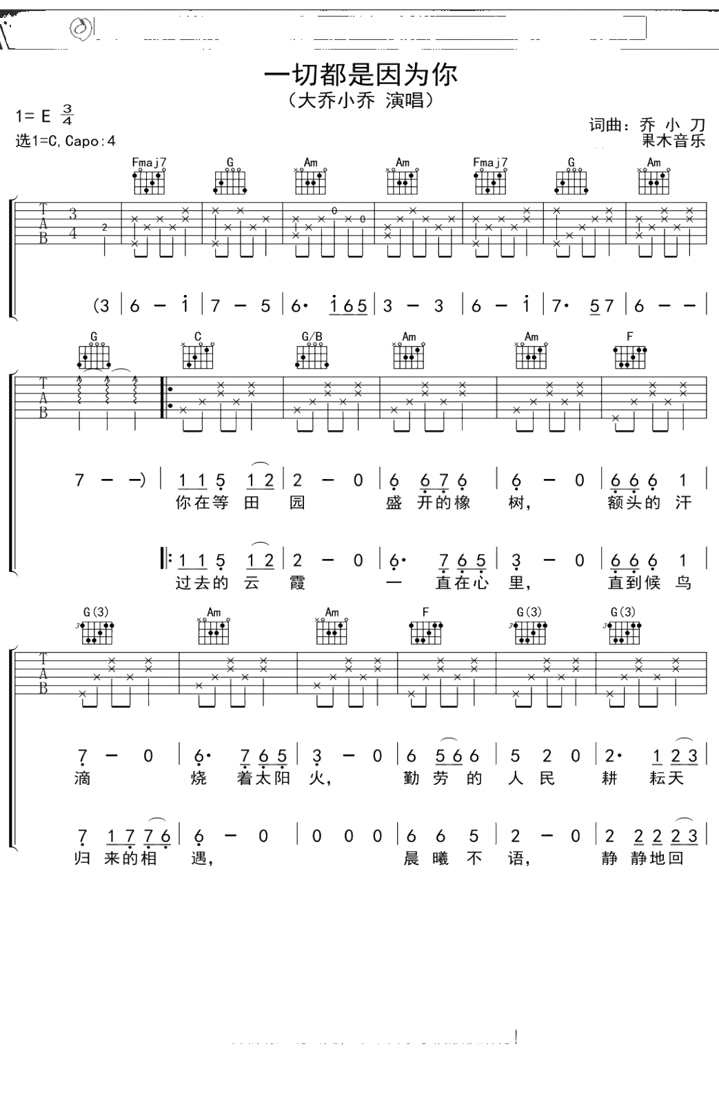 大乔小乔《一切都是因为你》吉他谱 弹唱六线谱