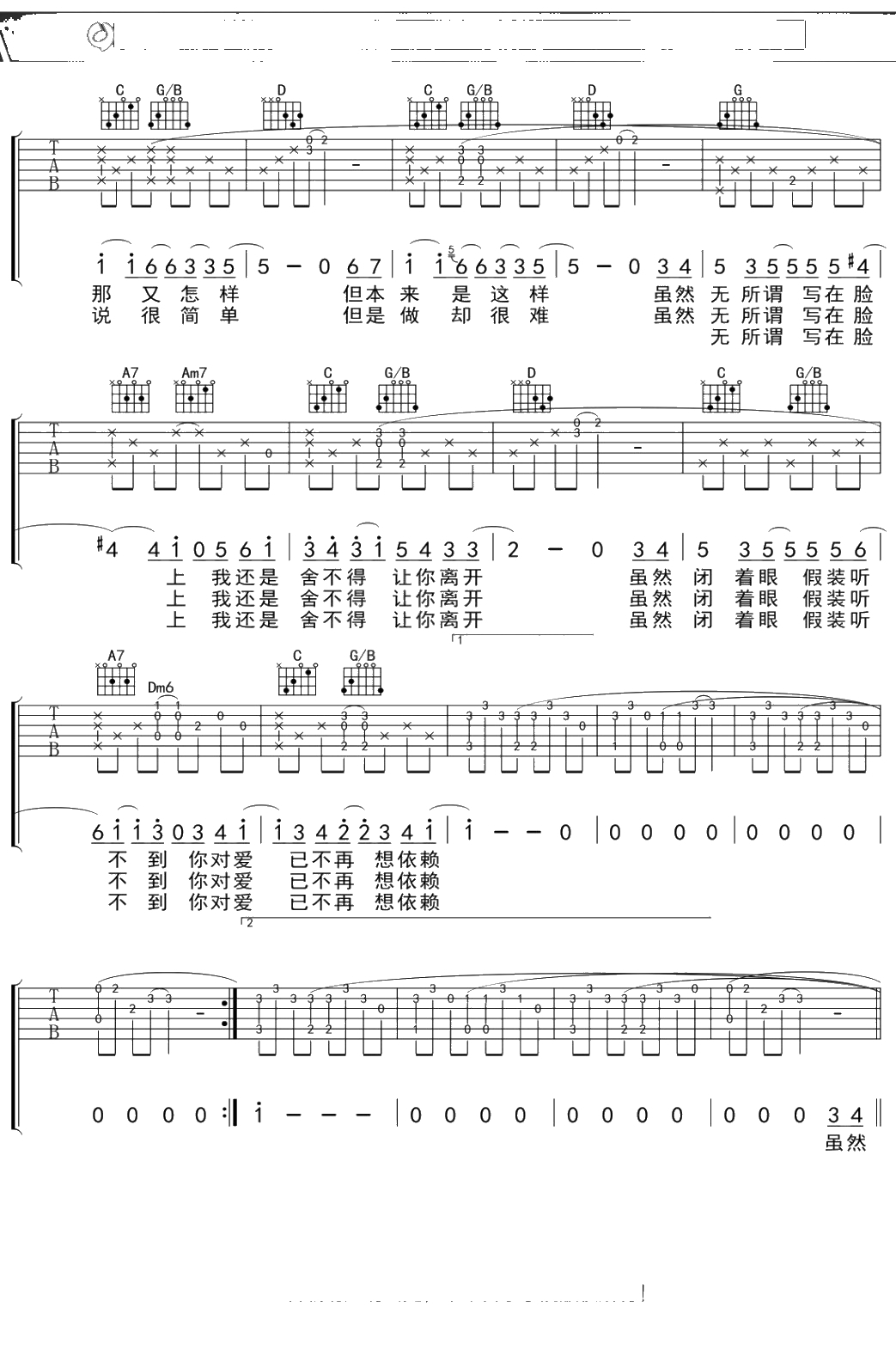 蔡健雅《依赖》吉他谱 弹唱六线谱