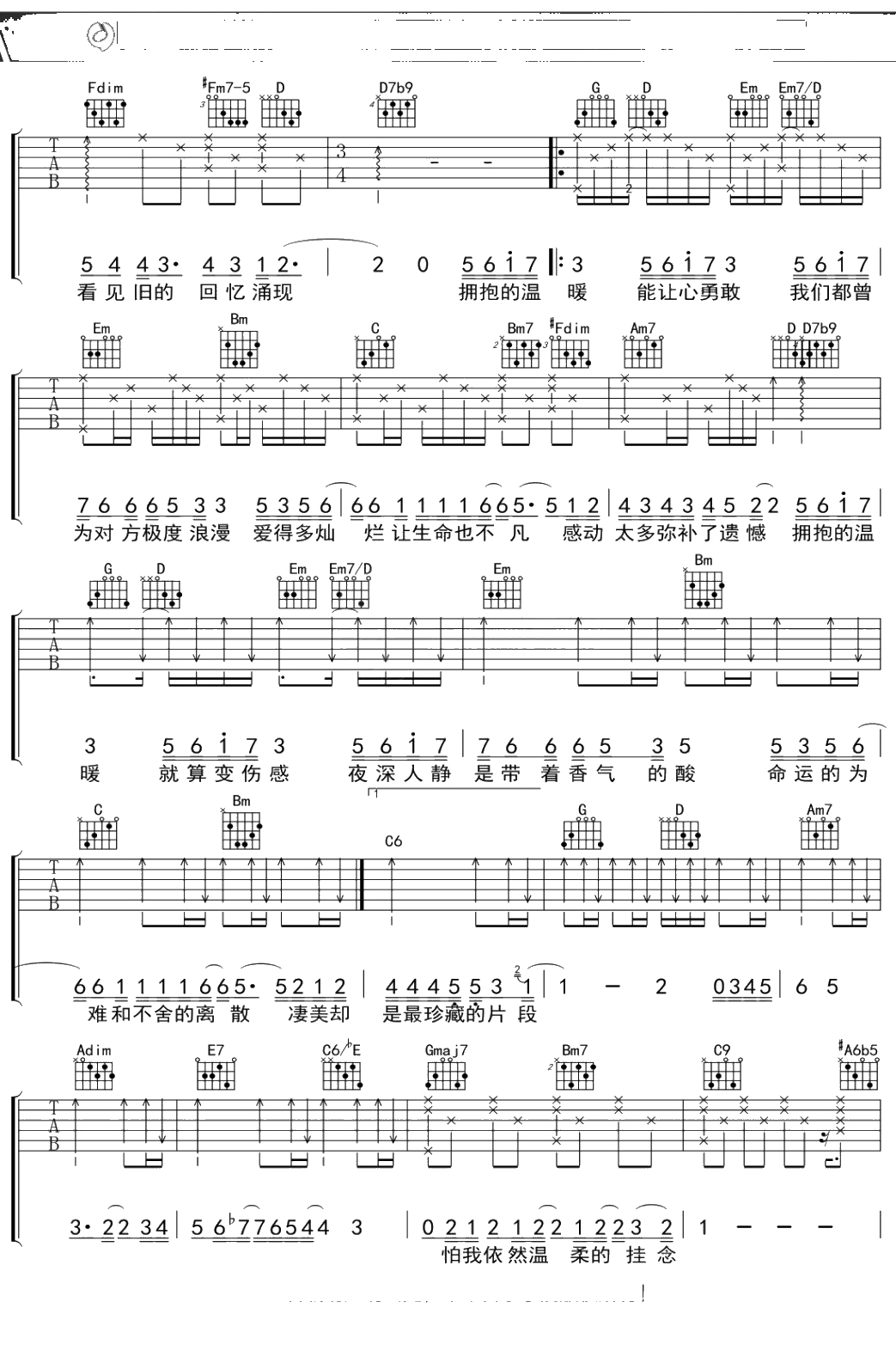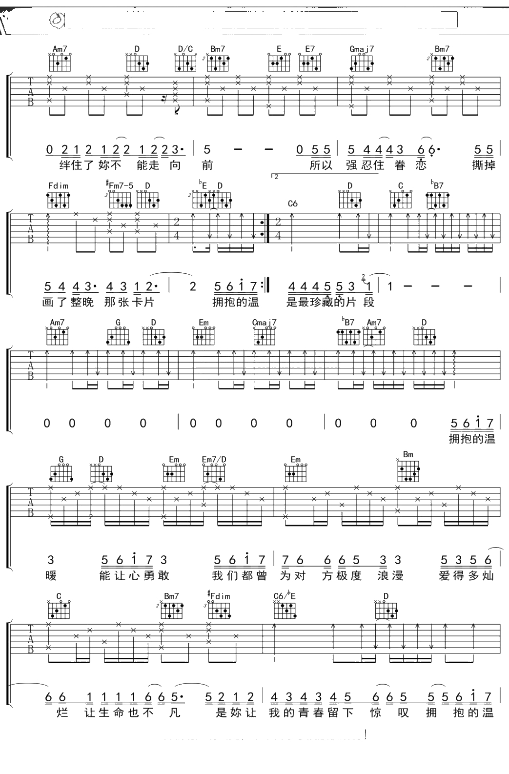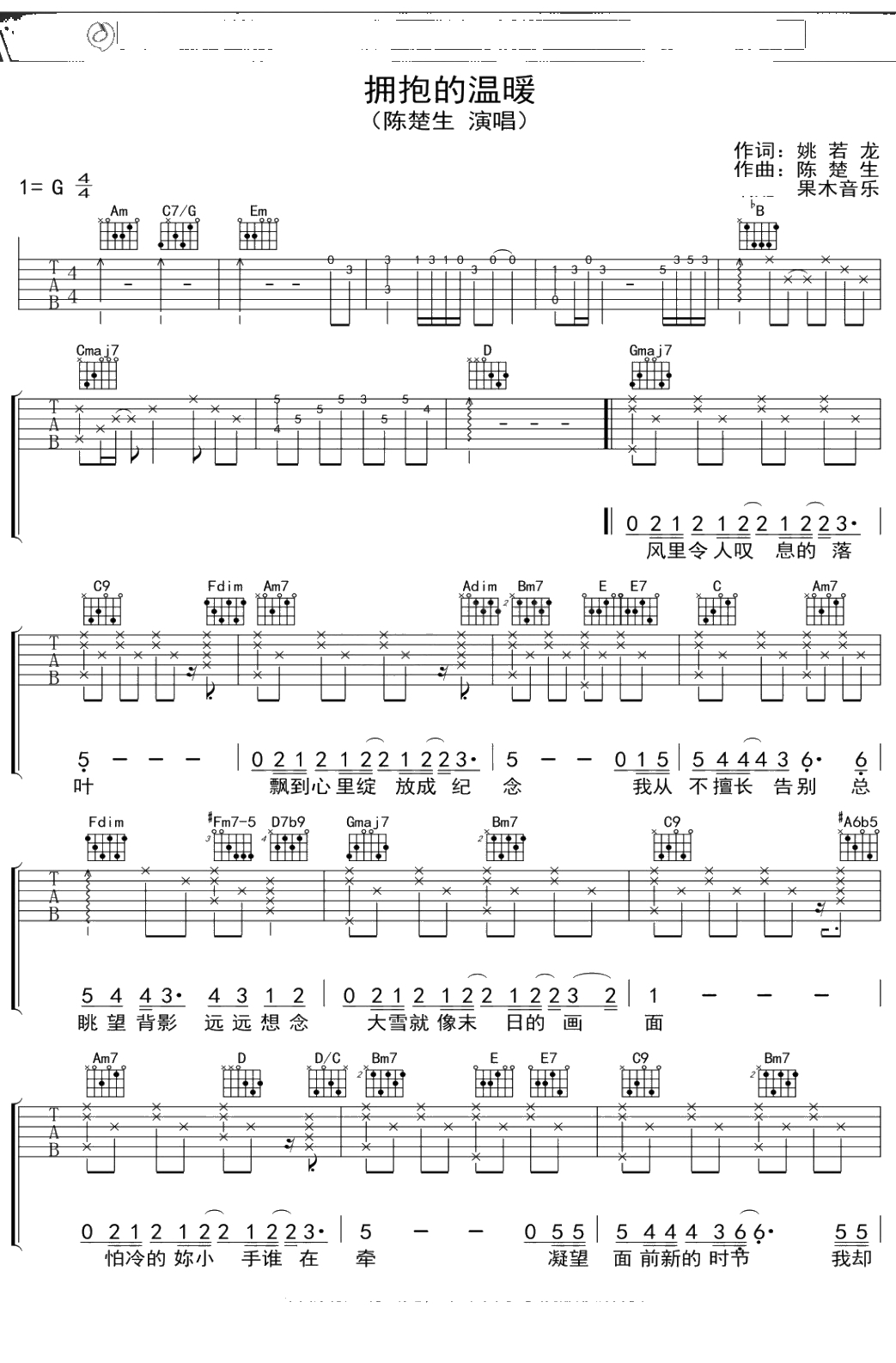 陈楚生《拥抱的温暖》吉他谱 弹唱六线谱