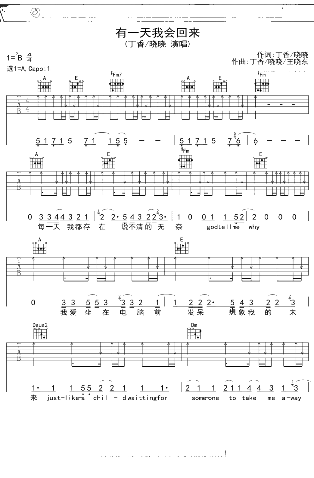 丁香、晓晓《有一天我会回来》吉他谱 弹唱六线谱