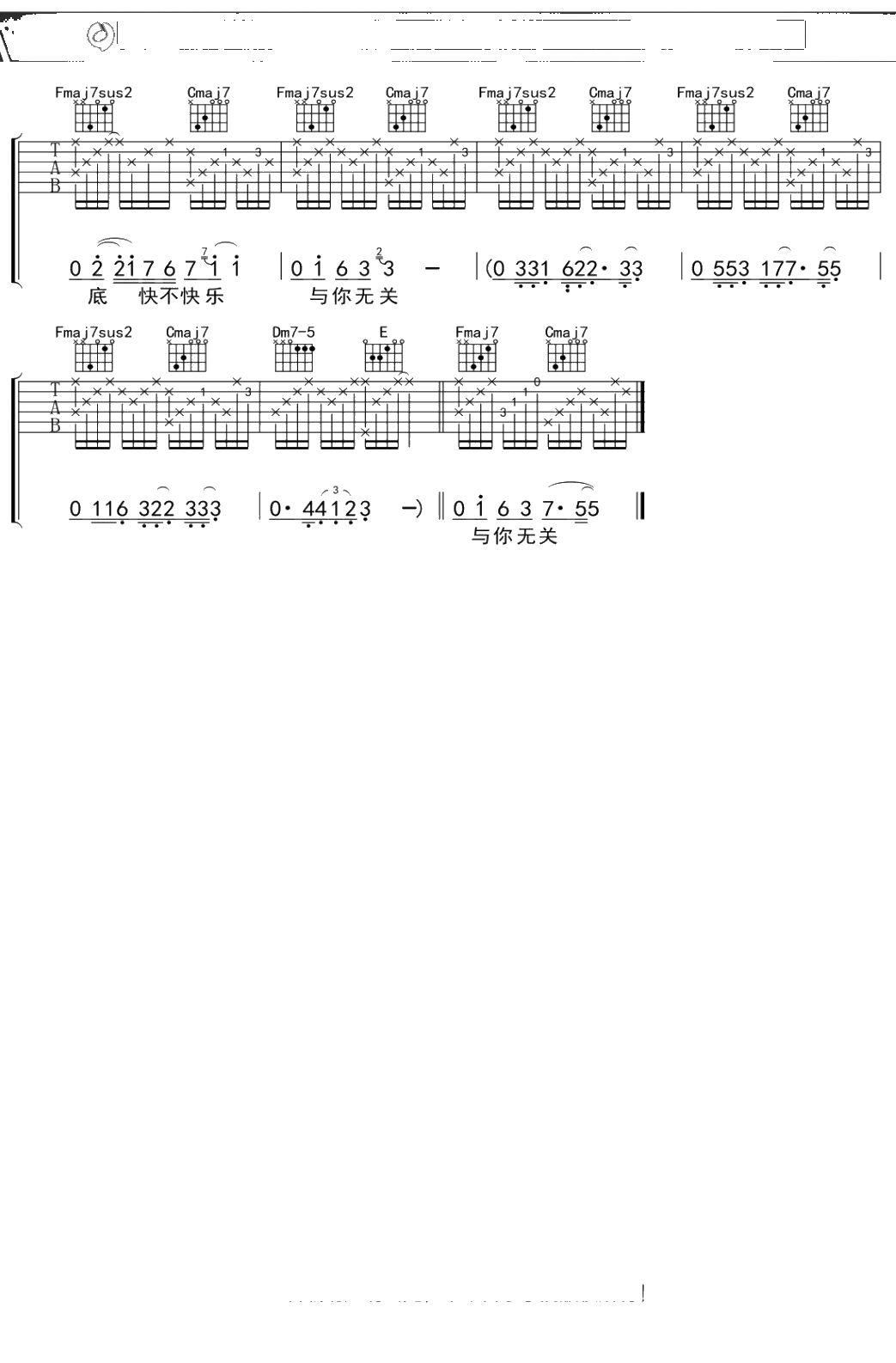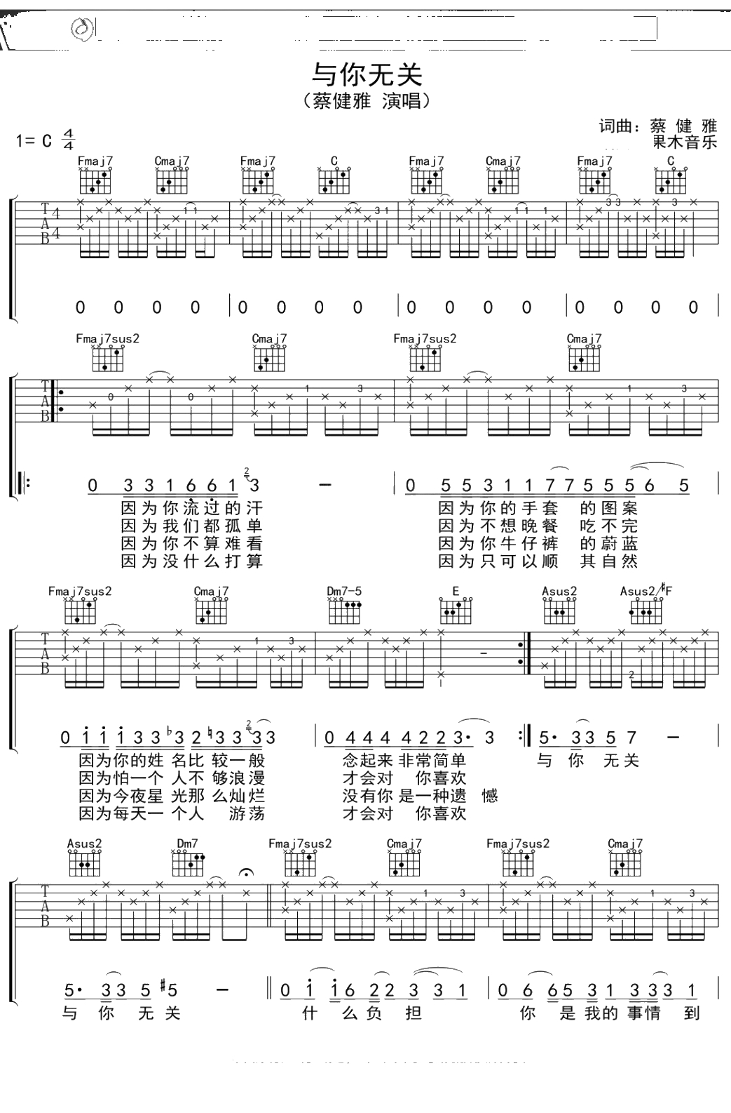蔡健雅《与你无关》吉他谱 弹唱六线谱