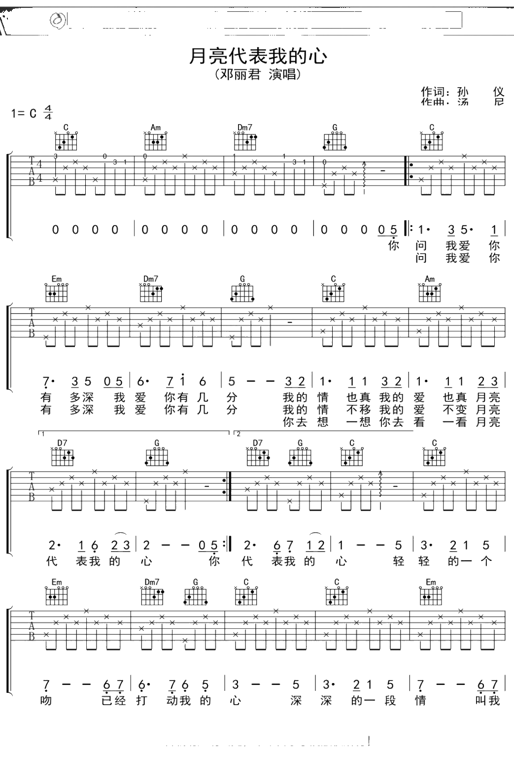 邓丽君《月亮代表我的心》吉他谱 弹唱六线谱